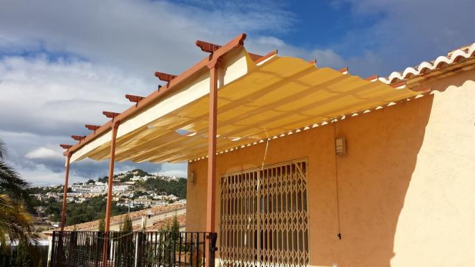 Pérgola en Calpe (Alicante), realizada en PVC y lacada en color madera cerezo